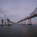 Description: photo of the SF Bay bridges, during rebuilding after an earthquate